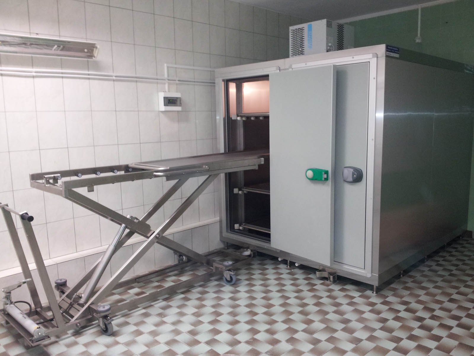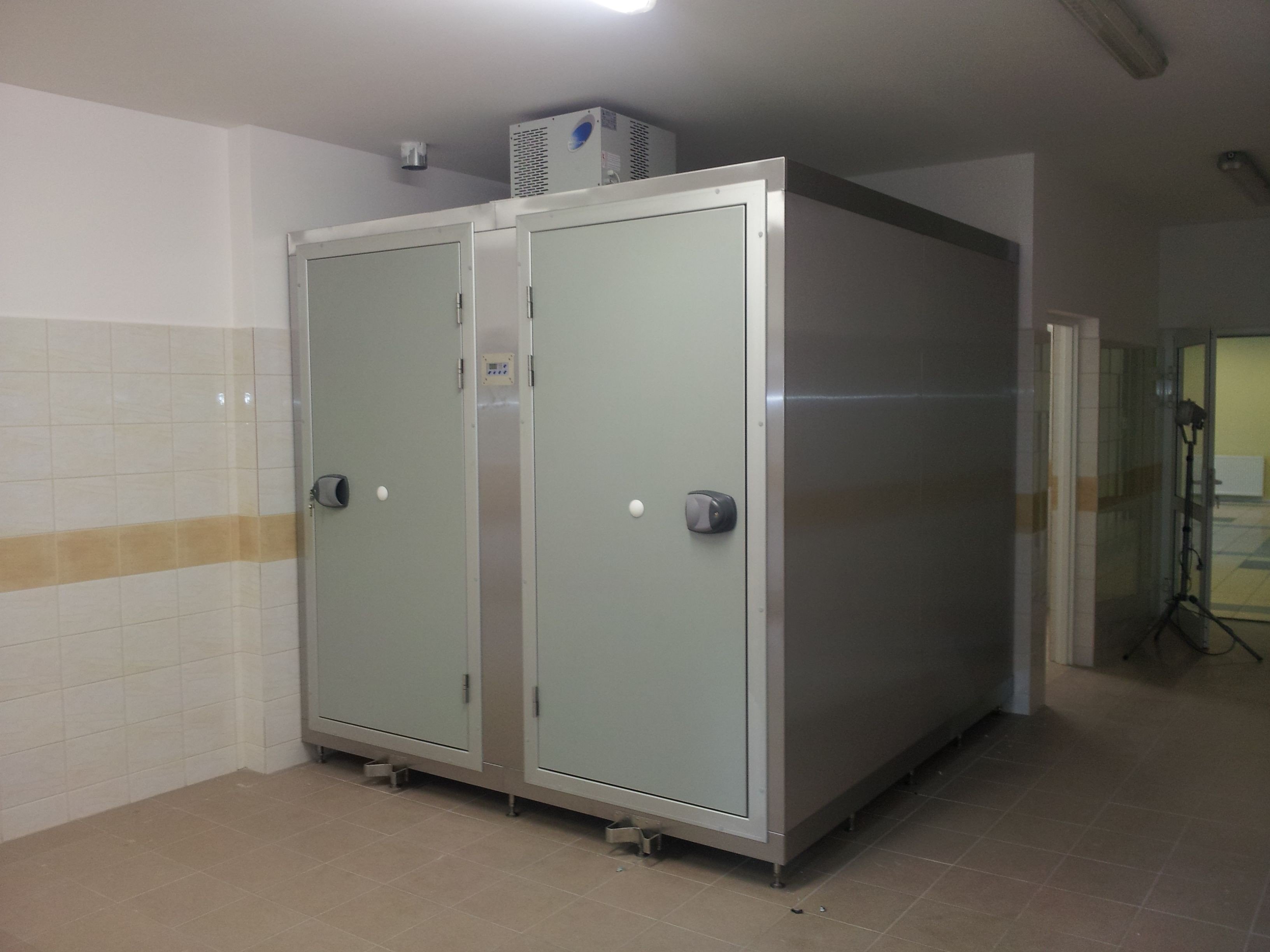 Chłodnia na zwłoki wykonana jest w nowoczesnej technologii (złącza typu CAM-LOCK) pozwalającej na dowolne kształtowanie przestrzeni na ciała. Izolacja komory wykonana jest ze spienionego, ekologicznego PU o grubości 100 mm. Komora wykonana w układzie dwudrzwiowym.