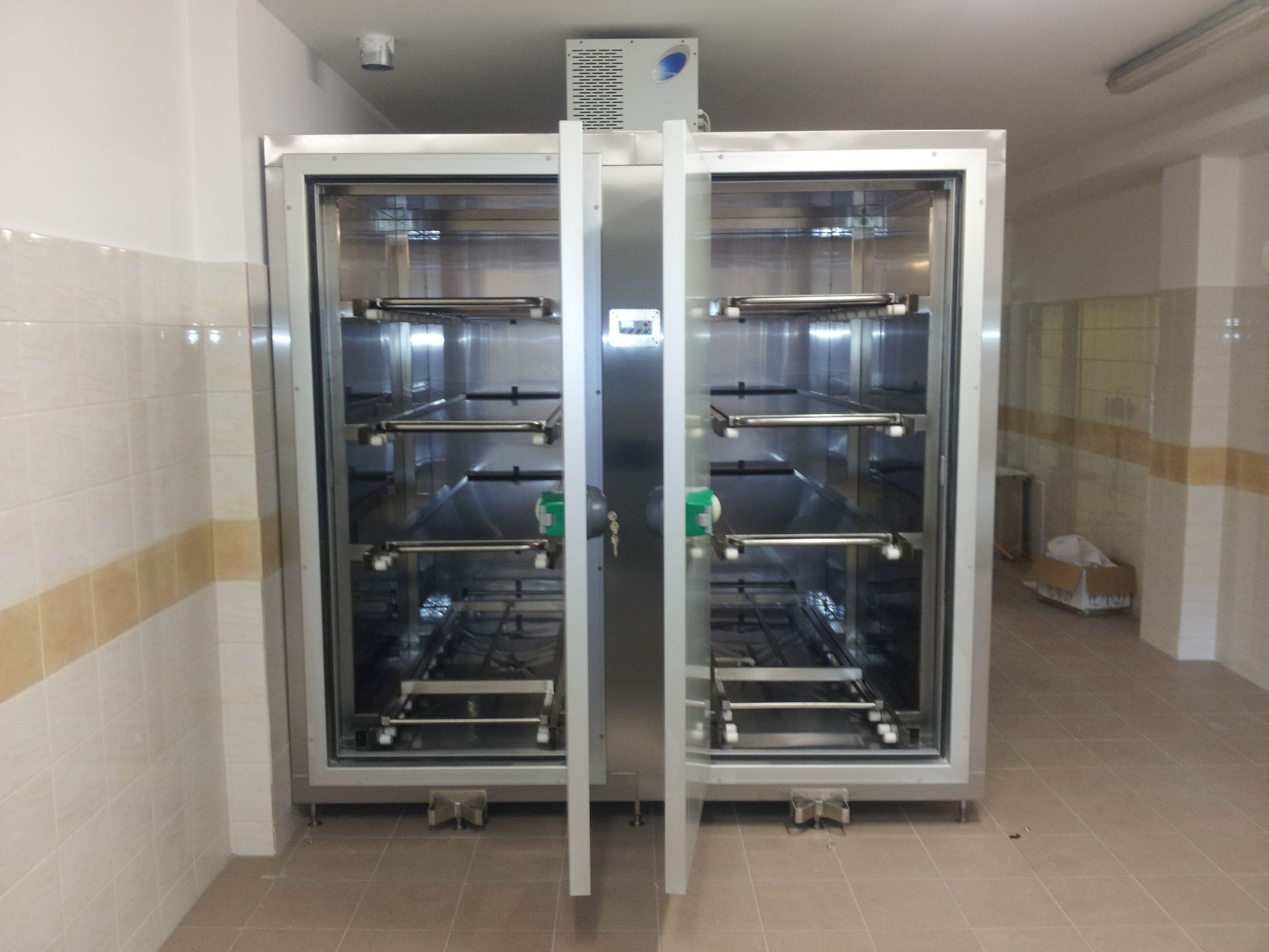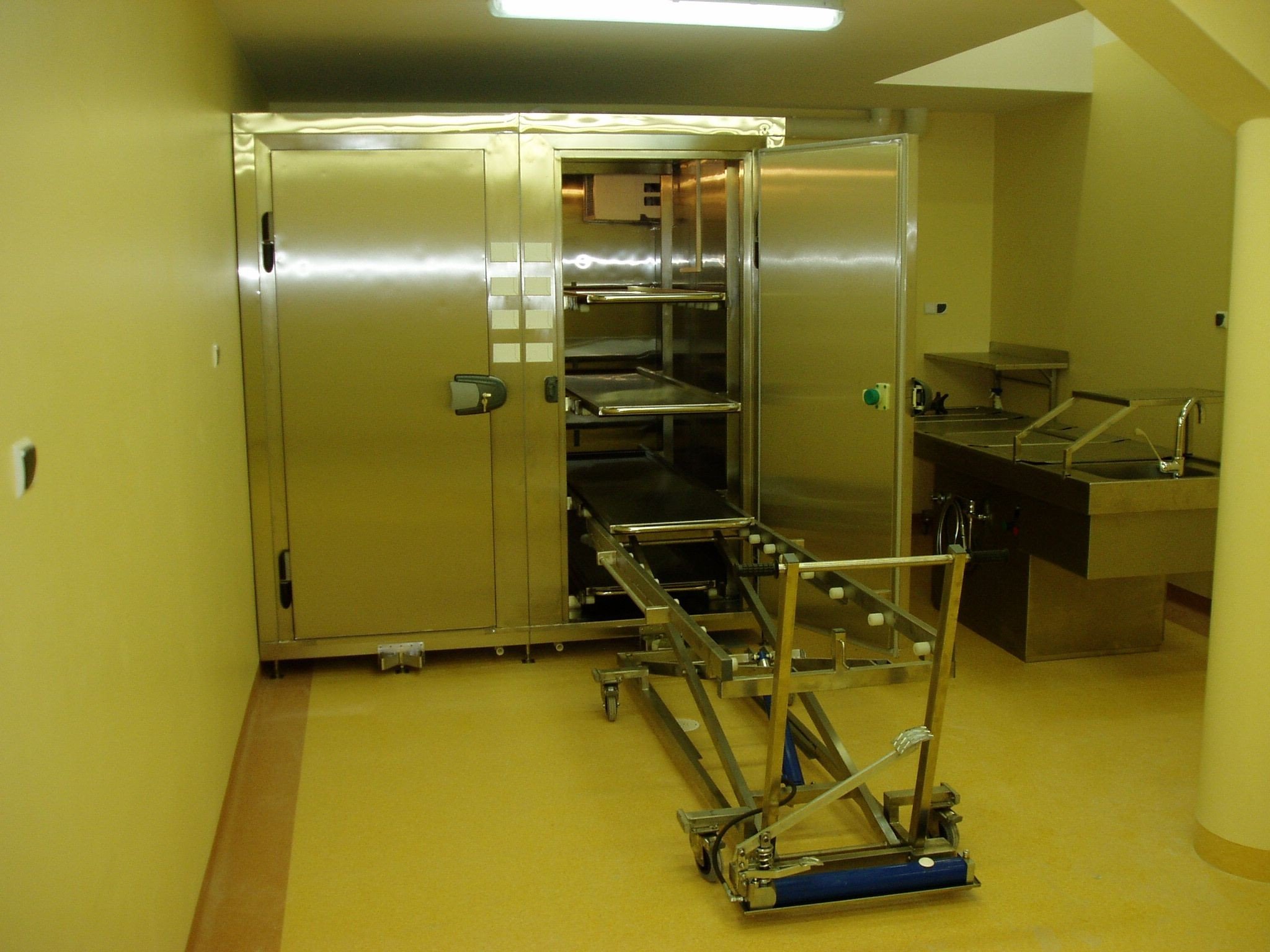 Komora chłodnicza do przechowywania 8 ciał na tacach lub w trumnach. Urządzenie oferowane jest w wykonaniu jakościowym wg standardów unijnych, tj. całe wnętrze komory oraz wyposażenie: tace, regały, wsporniki wykonane są z materiałów nierdzewnych ? kwasoodpornych, potwierdzonych odpowiednimi atestami i certyfikatami.